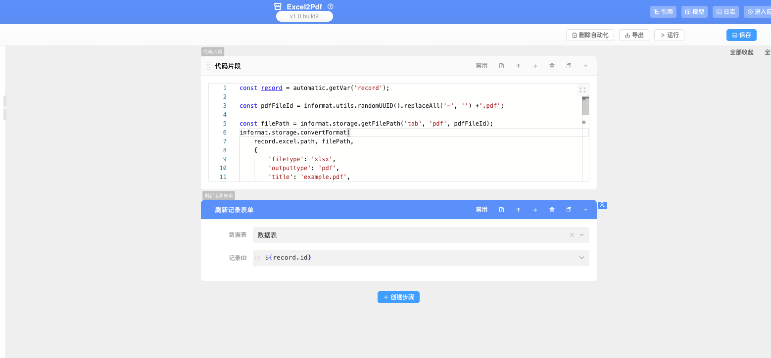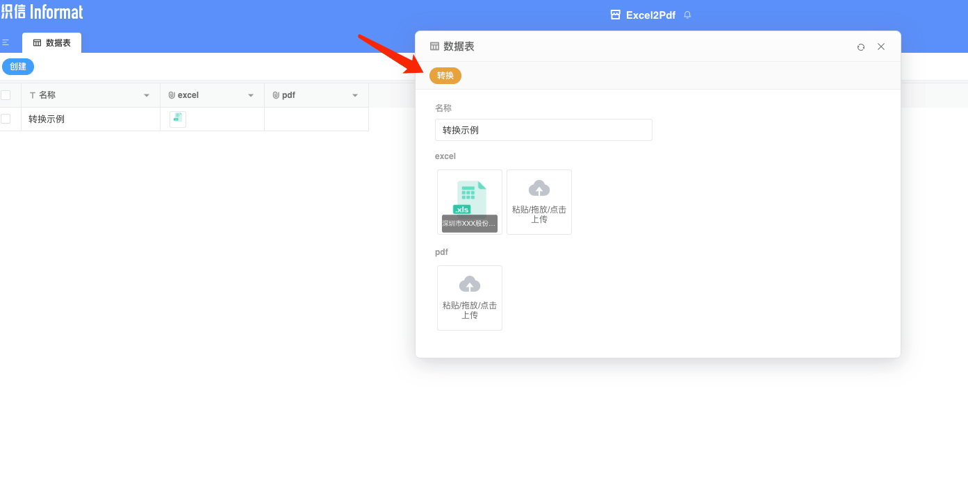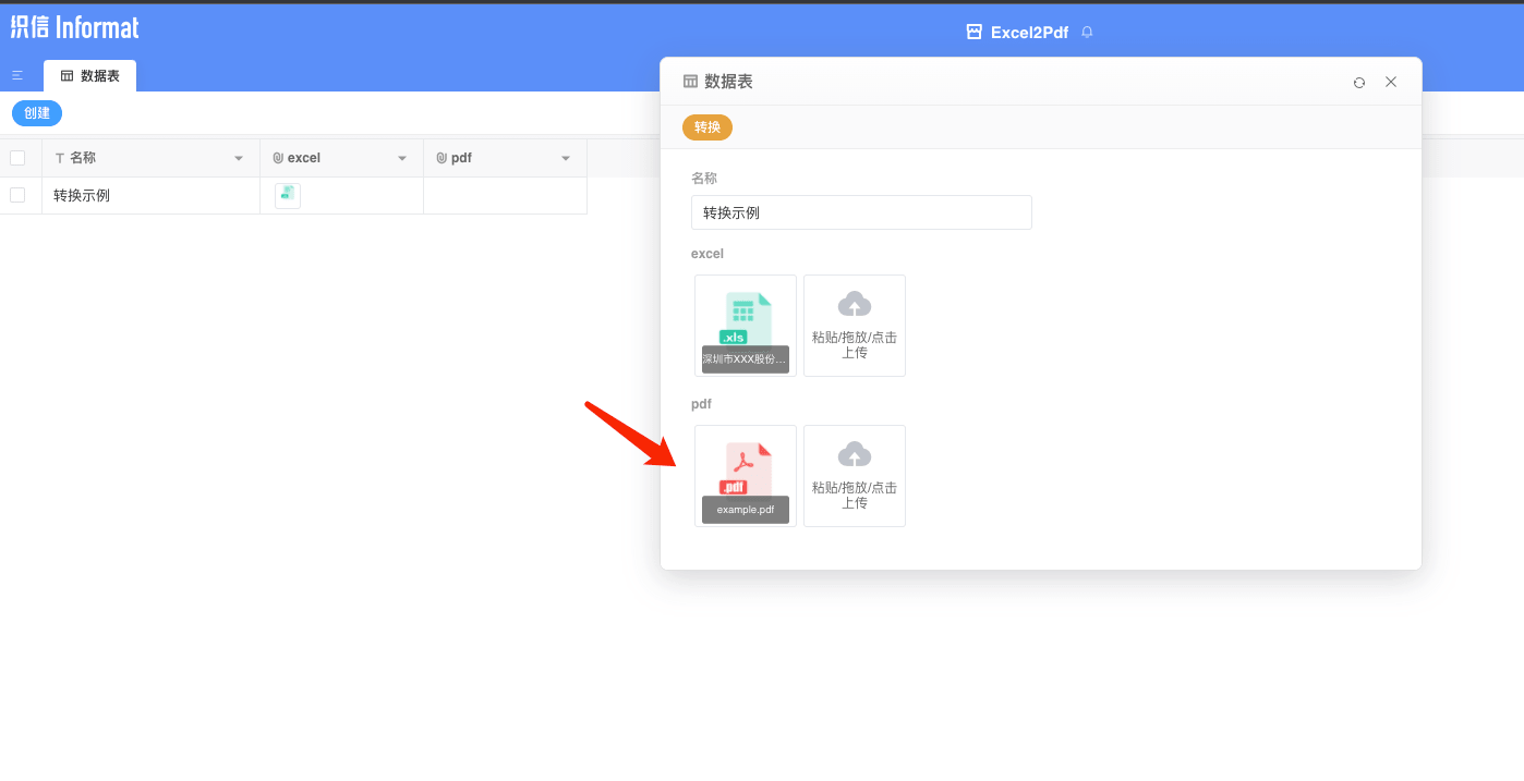 目前数据表有一个附件字段为excel文件,需要通过点击按钮将附件字段转换为pdf文件并且上传到对应字段中。