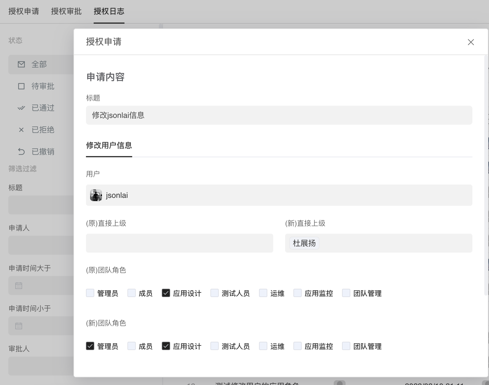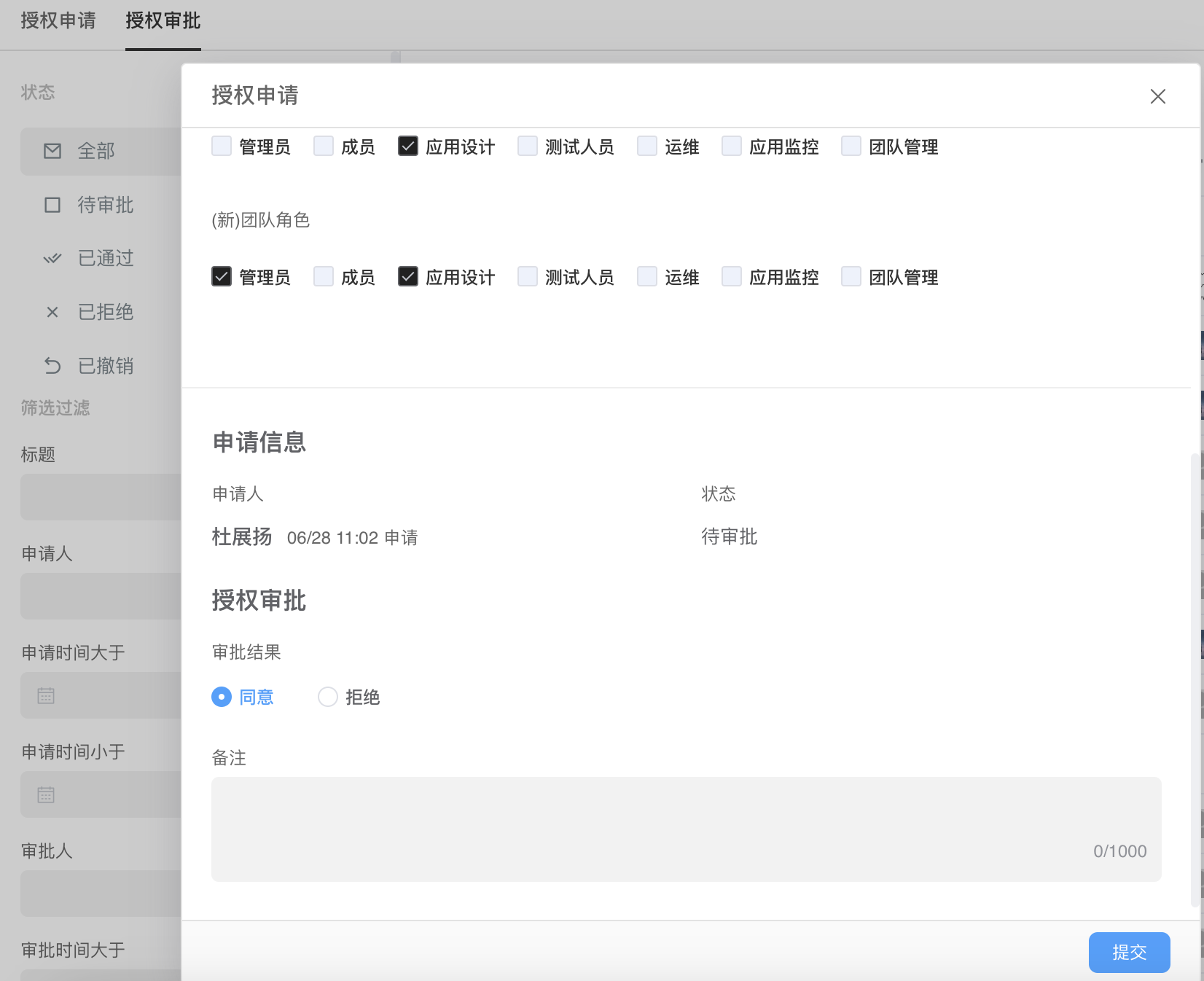 - 安全审计员 可以查看所有提交的用户授权申请和审批过程。