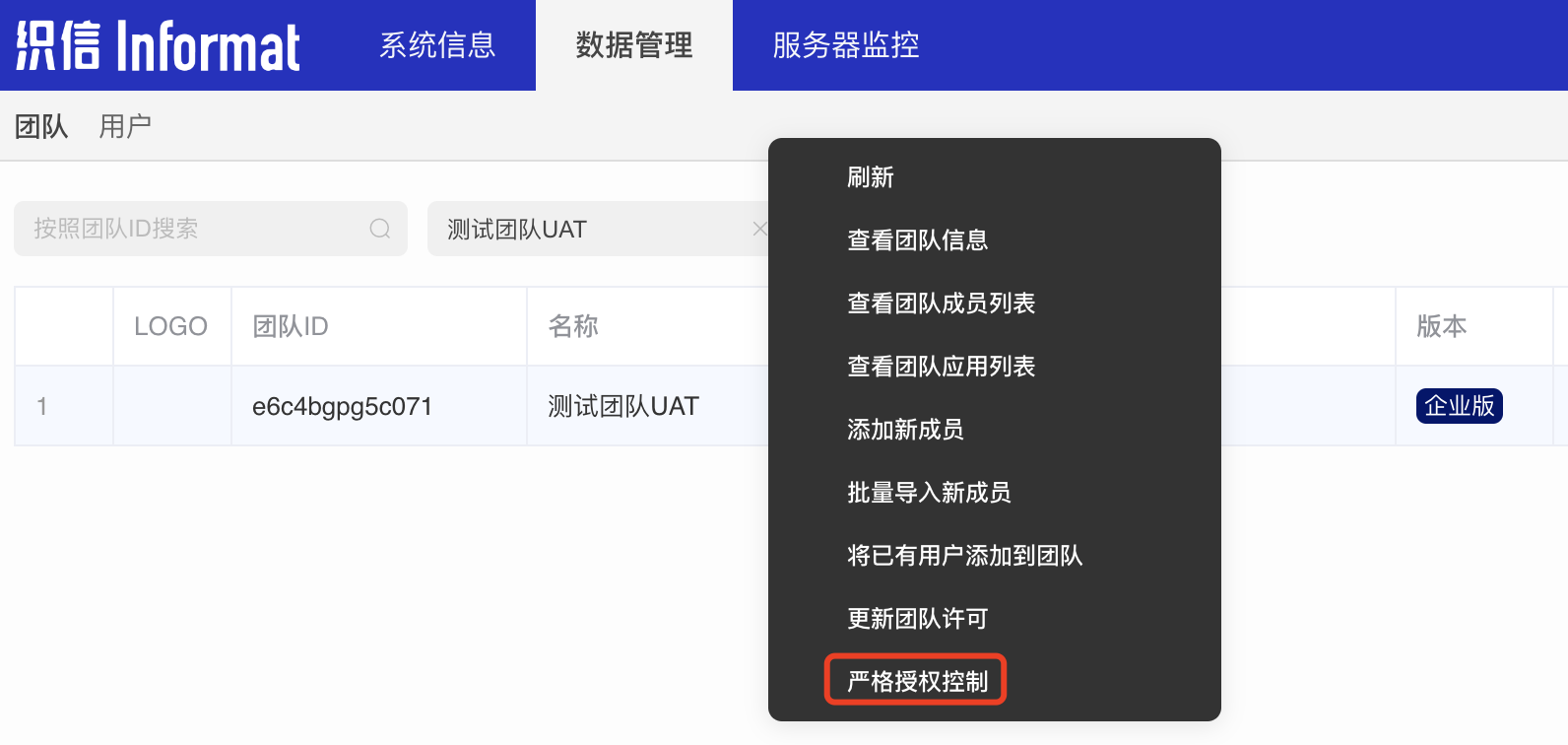 打开织信管理后台,选择「数据管理 >> 团队」,在团队列表中,筛选出需要开启的团队,点击右键