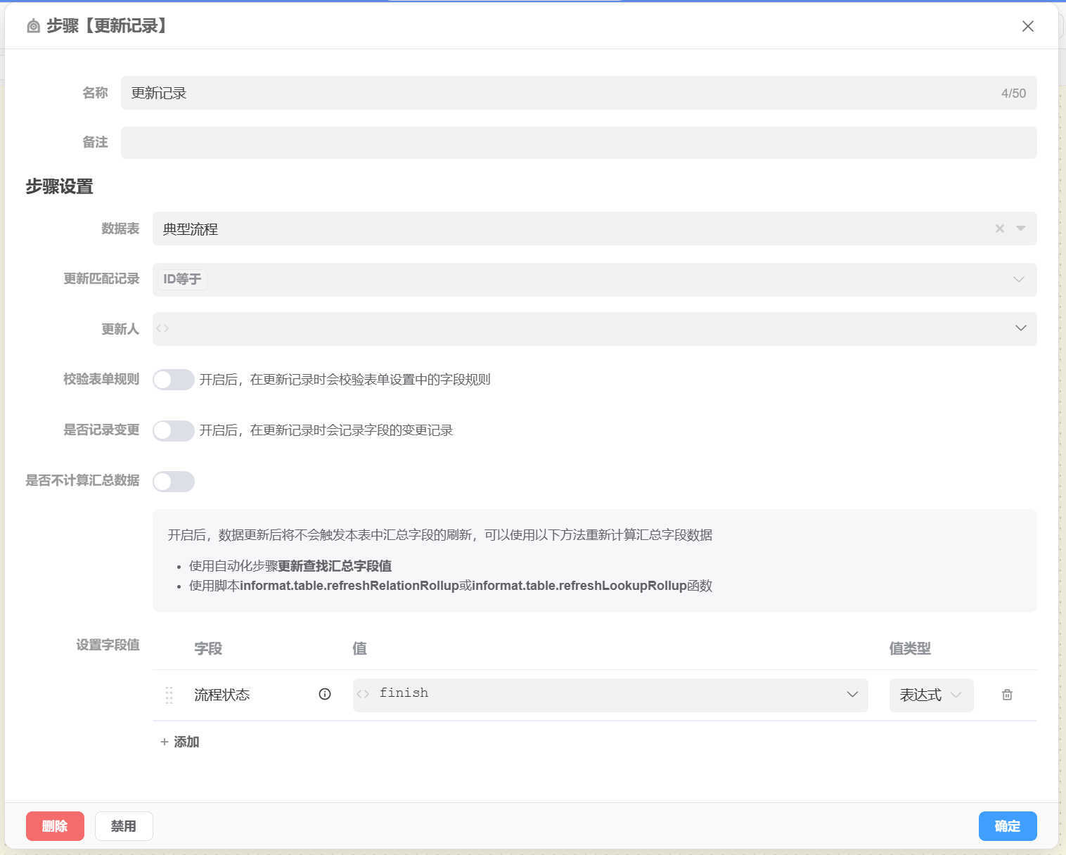最后,在全局设置了事件监听,监听事件为流程完成后,将调用自动化修改该记录的流程状态为入职完成。该自动化配置如下: