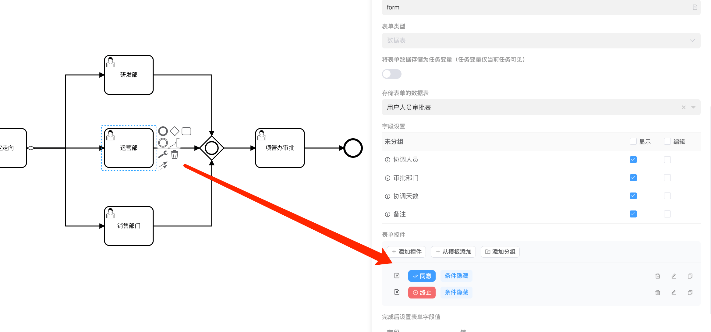 在每个用户任务审批的节点设置对应的审批人和控件。